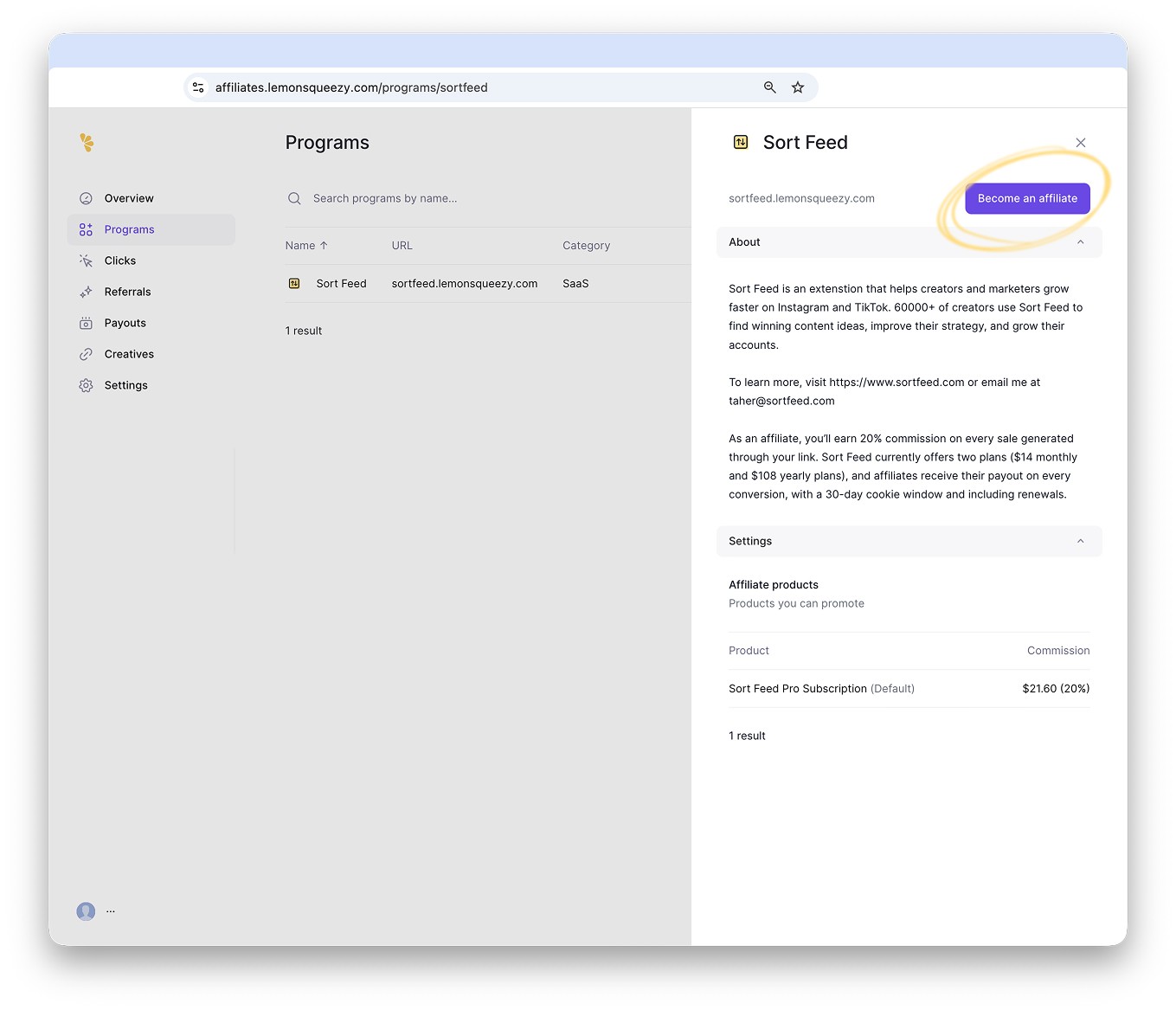 Second, once you’re approved, join the Sort Feed affiliate program. Lemon Squeezy will automatically generate your custom referral link so you can start promoting Sort Feed right away.